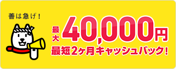 最短開通2ヵ月後、新規の場合40,000円を現金でキャッシュバックいたします!しかも有料オプションの加入も不要!